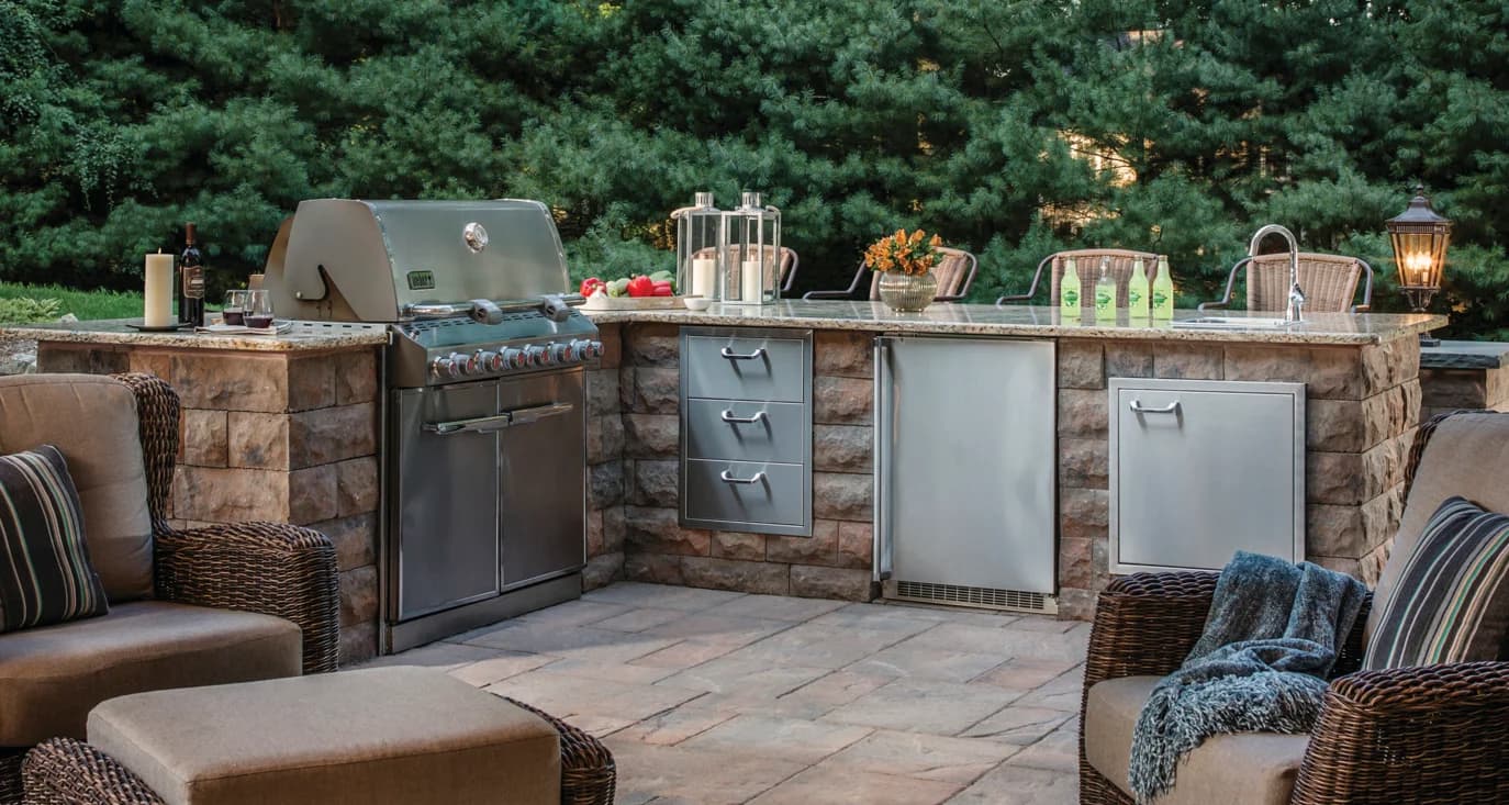 Outdoor kitchens in [Your Service Areas] and all over the country have certainly become one of the hottest items in home building in the last few years. You can get the same options from your indoor kitchen and you can put those things in your outdoor kitchen. For example, you can get cabinets, grills, refrigerators, sinks & much more. For most, the basic item for your outdoor kitchen is a barbecue grill — don’t forget that what makes it a kitchen is that you have a place to cook. You can get a prefab grill, a semi-custom grill or a grill that is custom built for your outdoor kitchen and outdoor living experience.